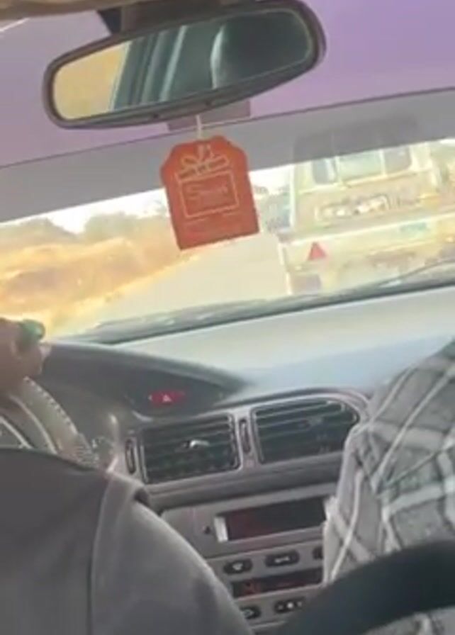 The video is taken from inside a car, looking out through the windshield. The dashboard and the back of the front seats are visible. An orange air freshener hangs from the rearview mirror. The car is moving on a road with a vehicle in front and other cars and a motorcycle in the distance. The environment outside looks like a dusty or rural area. The camera focuses and unfocuses.