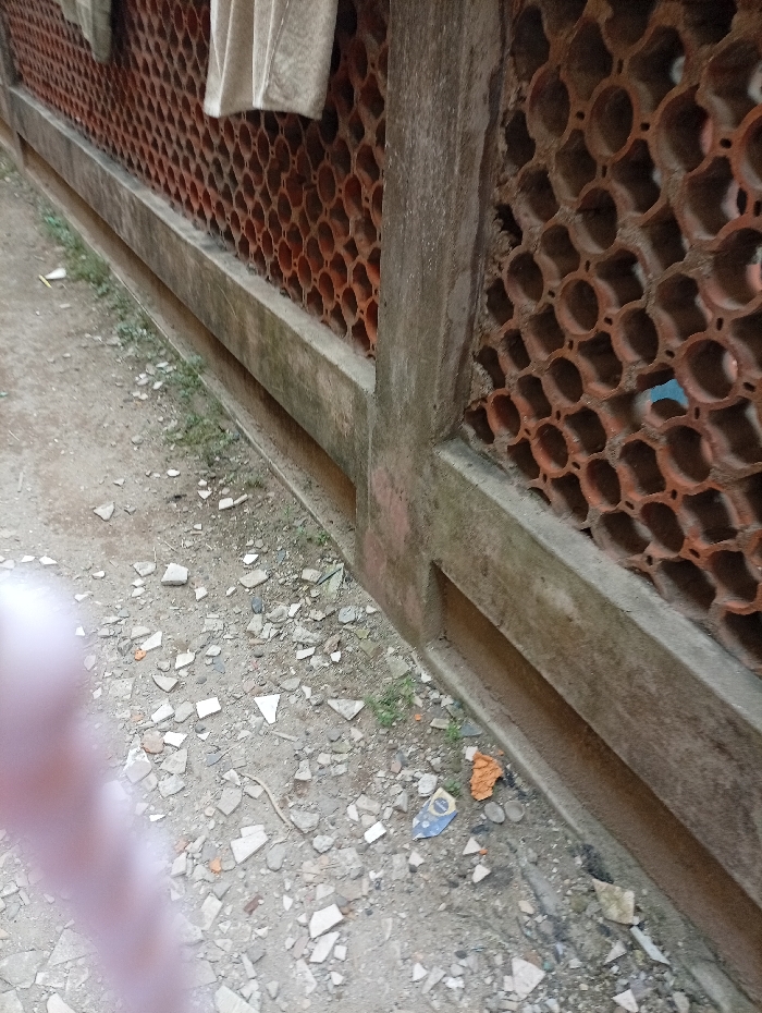 The scene depicts an outdoor setting in Lagos, Nigeria, focusing on a section of a perimeter wall adjacent to a ground path. The wall is constructed from reddish-brown, perforated terracotta blocks arranged in a repeating circular, honeycomb-like pattern, supported and framed by grey concrete pillars and horizontal beams. Two pieces of light-colored fabric are draped over the top edge of the terracotta wall. The ground is composed of loose dirt and gravel, heavily scattered with various sizes of white and grey tile fragments, small stones, and sparse green vegetation. Visible debris on the ground includes a blue and white wrapper, and a crumpled orange-brown material piece. A blurred, flesh-toned object, consistent with a human finger, partially obscures the lower-left foreground. No individuals are clearly identifiable, and no specific actions or interactions are depicted within the visible frame, beyond the implied act of photography.