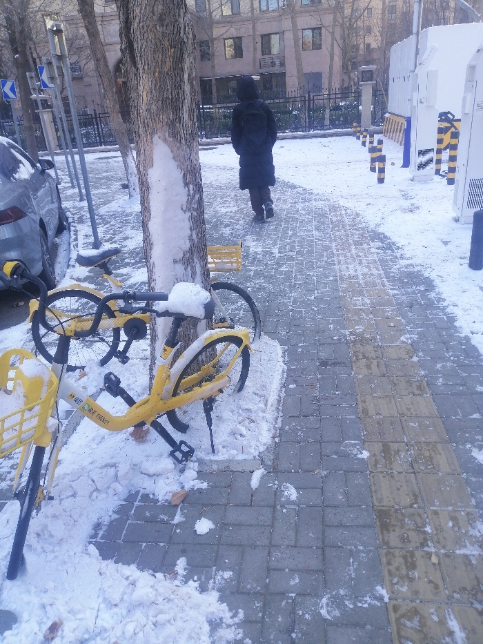 A street scene in winter shows a yellow bicycle leaning against a snow-covered tree. A person in a dark coat and hood walks away from the bicycle on a snow-dusted walkway. A car is parked nearby. The brick walkway is partially cleared, and a row of buildings is visible in the background. The scene suggests a cold climate and recent snowfall.