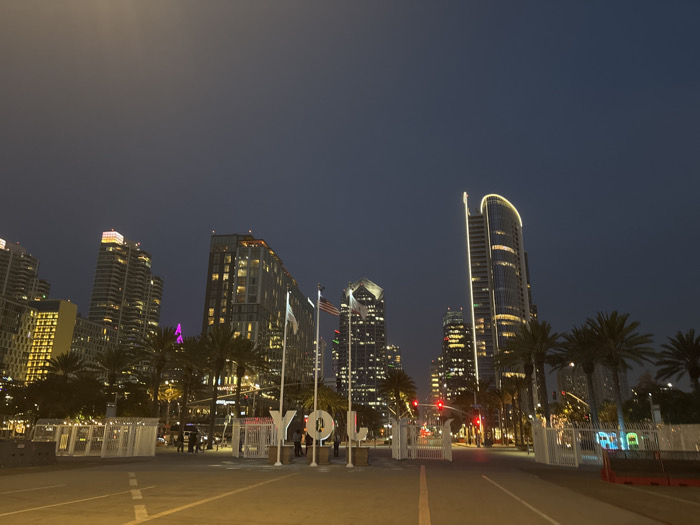 At dusk, the San Diego skyline glows, featuring several illuminated high-rise buildings. Palm trees line the street, flanking a wide road with visible white and yellow lane markings. White structures resembling gates stand on either side of the road, creating an entrance point. The letters "YOU" are prominently displayed at the entrance, partially obscured by people standing nearby. The overall atmosphere is urban and peaceful.