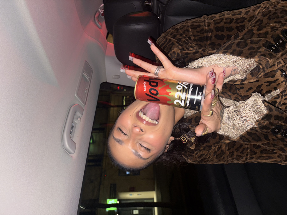 A woman reclines in a car seat, holding a can of "Cody's Vodka Energy Mix 22%" to the camera. Her mouth is open, tongue extended. She wears a brown leopard print jacket over a lace-trimmed top, adorned with rings on her fingers and long, decorated nails. The car's interior includes black leather seats and a light gray ceiling panel.
