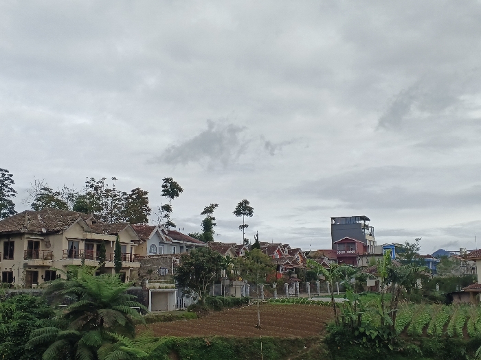 A cloudy sky hangs over a landscape featuring several houses and buildings. The structures vary in design and color, with some appearing older and others more modern. Lush greenery and trees are scattered throughout the scene, with a field of brown earth visible in the foreground. The overall impression is one of a residential area nestled in a natural environment.