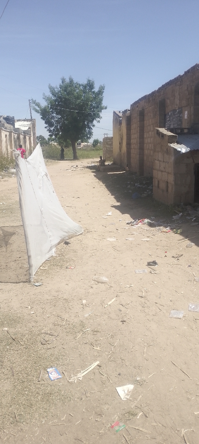 The image depicts an unpaved, dirt path in Dabawa, Nigeria, under a clear, light blue sky. The foreground and midground consist of dry, light brown earth littered with various debris, including plastic bags, wrappers, and discarded paper. To the left, a tall, white mesh or fabric object, possibly a mosquito net or large sheet, stands upright, supported by an unseen structure. Along the right side of the path, a long, contiguous structure built from light brown blocks or mud bricks shows signs of disrepair, with multiple rectangular openings that appear to be former window or door frames. A small section of corrugated metal roofing is visible on a lower portion of this structure near the foreground. A distinct shadow is cast by this building onto the path. Three individuals are present. One person, possibly a child, is seated on a low structure or step next to the damaged building on the right, primarily within the shadow. Further down the path, near a prominent green tree in the mid-background, another individual in dark clothing stands facing towards the right. Partially obscured behind the white fabric object on the left, a third person is visible wearing a red shirt. In the mid-background, a large, leafy green tree stands prominently. Distant, less defined structures are visible in the far background under the clear sky. Thin power or communication lines are visible spanning across the upper mid-background. The overall scene suggests a residential or community area with basic infrastructure.