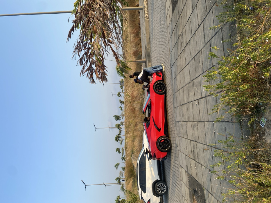 A red Corvette convertible and a white SUV are parked on a paved road. Two people lean over the Corvette. Palm trees and tall grass are nearby. A utility pole is visible in the distance under a blue sky. A bushy green plant is in the foreground.