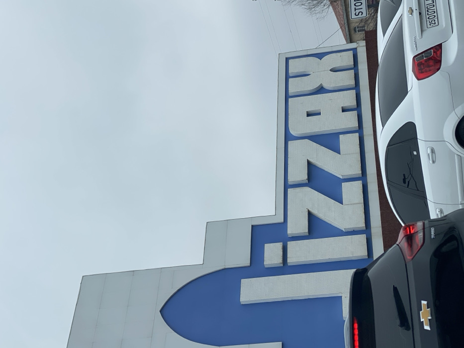 The image displays a street-level scene in Jizzakh, Uzbekistan, centered on a large outdoor sign. The sign features the word "JIZZAX" in prominent, textured white block letters on a blue background. The 'J' is partially obscured by the foreground. The sign structure includes a light grey frame and an arched blue element in its upper left quadrant. In the lower left foreground, the rear of a dark-colored Chevrolet crossover SUV is visible, featuring an illuminated red left taillight and a "TURBO" badge. Adjacent to it, occupying the lower midground, is a white Chevrolet sedan displaying a license plate numbered "25 070 LG". Another vehicle is partially visible behind the white sedan. The sky overhead is overcast and light grey. To the far right, a portion of a light-colored building with a brown roof is visible, along with a white rectangular sign displaying the word "STOP" in black letters. Bare tree branches and utility lines are present in the upper right background. No individuals are visible within the frame.