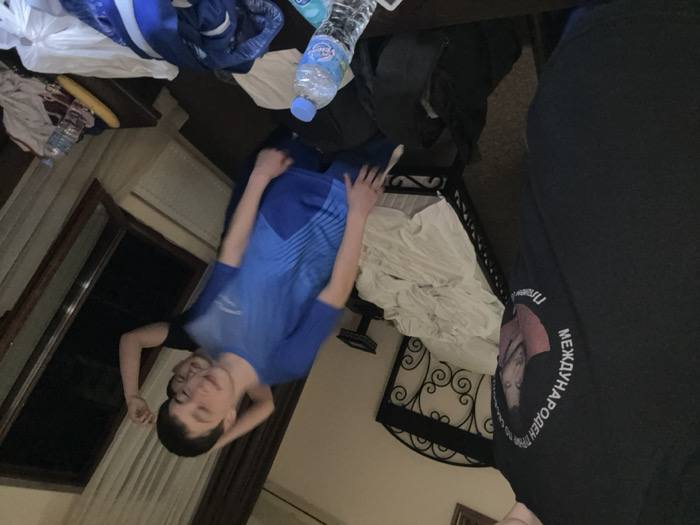 The image depicts an indoor scene within a private room located in Galabovo, Bulgaria. The room is dimly lit, illuminated by artificial light sources. Three young males are present. In the left foreground, partially visible, a person wears a black t-shirt featuring a circular graphic. The graphic displays a man's face, with Cyrillic text "МЕЖДУНАРОДЕН ТУРНИР ПО С(ИЛИ)..." (International Tournament in...) arching above it and "ПЛЕВНЕЛИЕВ" (Plevneliev) below the face. In the center, a male, appearing blurred due to motion, wears a blue athletic t-shirt with lighter blue and white patterns. His eyes are partially closed, and his head is slightly tilted. Directly behind him, another male is partially visible, with his arms raised, potentially touching the central figure's head or adjusting his own hair. To the left, a single bed with a decorative black metal headboard is visible, its white linens disheveled. A small, dark nightstand is positioned beside the bed. To the right, a large window with dark panes and partially drawn curtains provides a view to an unseen exterior, suggesting nighttime or heavily tinted glass. A white radiator is installed below the window, and a white air conditioning unit is mounted on the wall above it. A framed picture hangs on the wall above the bed. In the immediate foreground, a dark surface, possibly a table or chest, is cluttered with various items. These include two plastic water bottles (one clearly branded "Devin," another "Pchelina"), disheveled blue and white clothing (likely athletic wear), a black bag, a yellow object resembling a banana, and white textile items such as a towel or fabric. The overall scene suggests a casual, possibly playful or transitional moment in a personal living space.