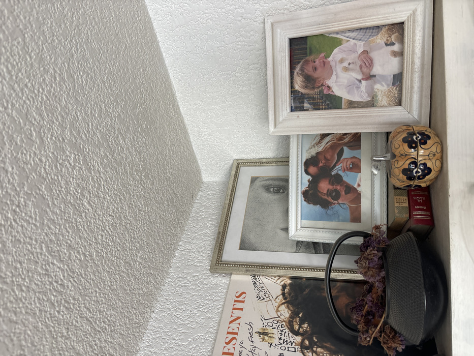 The image depicts a collection of items stacked on a shelf or ledge. Several framed pictures are visible, including a portrait of a child holding a cat, a woman in sunglasses, and a black-and-white drawing of a face. A decorative wooden box with floral patterns sits alongside small books with red covers. A dark, rounded object with dried purple flowers is also present, possibly a teapot or kettle. The background consists of a textured white wall and ceiling.