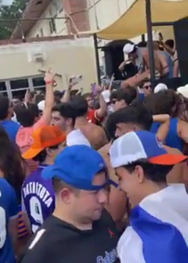large crowd of people, mostly young adults, gathered outdoors. They are standing close together, many of them wearing blue and orange clothing, and appear to be at some kind of party or gathering. Some are dancing and cheering, while others are talking and mingling. There is a raised platform with speakers and a covering overhead, where some people are standing and interacting with the crowd. The setting appears to be near a building, possibly a fraternity house, with a brick facade and trees in the background. The overall atmosphere is lively and energetic.