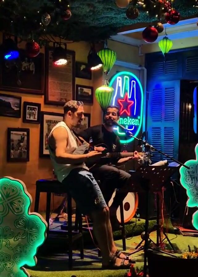 Two men are playing music in what appears to be a bar. The man on the left is playing a ukulele and singing. He's wearing a white tank top, blue shorts, and sandals, and seated on a bar stool. The man on the right is playing a guitar and appears to be singing harmonies. He is dressed in black, and is also seated on a bar stool. A small drum set is positioned between them. A neon Heineken sign glows behind them. The room is decorated with festive lighting, including Christmas ornaments hanging from the ceiling and shamrock-shaped lights around the stage. Photographs and what appears to be a framed document hang on the wall. The bar looks to be Irish themed.