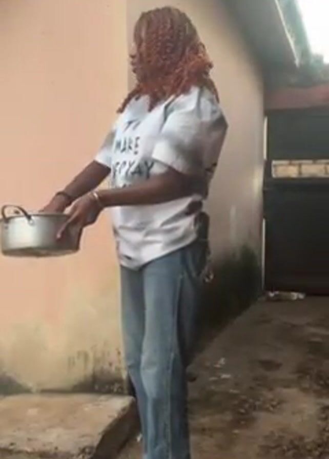 A woman with reddish-brown curly hair stands outside, holding a pot in her left hand and a spoon in her right