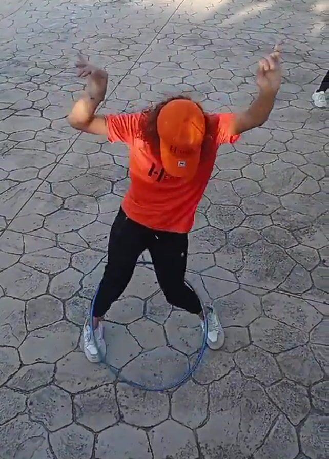 A woman is dancing and twirling a hula hoop near a swimming pool at a resort. She wears an orange t-shirt with black leggings, a matching orange baseball cap, and white tennis shoes. She has curly brown hair. The patio has a light grey patterned cobblestone design. Other resort staff members are nearby doing the same activity. The woman smiles and waves to the camera.