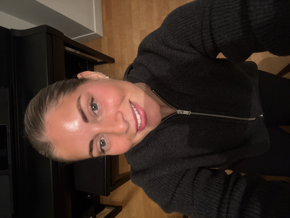 A person smiles warmly at the camera, positioned at an angle. They have fair skin, light eyes, and light-colored hair pulled back. They wear a dark, zip-up sweater. A black piano-like object is partially visible on the left, and a wooden floor is in the background.