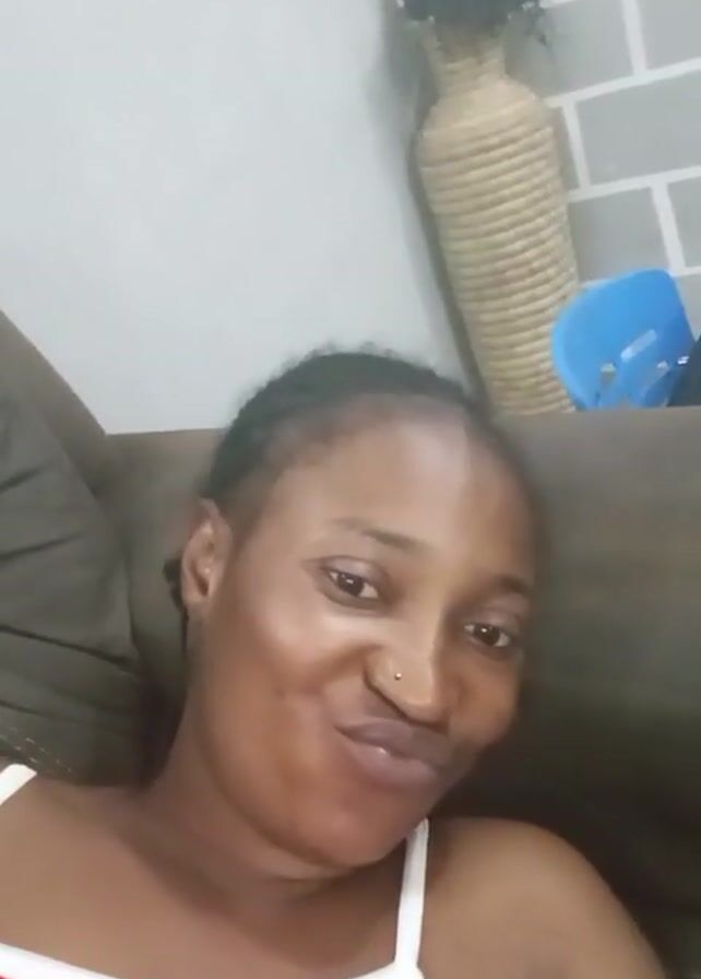A woman is seen in a selfie, wearing a red top with white straps. She has braided hair and a nose piercing. She initially makes a pouting face, then smiles. She is lying on a brown couch. In the background, there is a gray brick-patterned wall, a woven vase, and a blue plastic stool. The video then goes to a black screen.