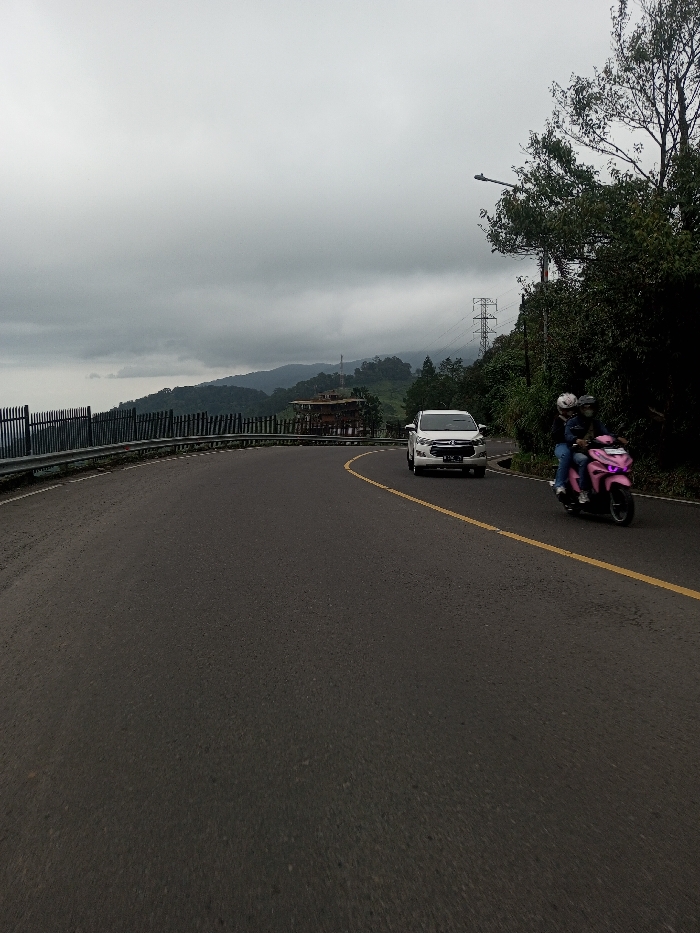 The image displays a curved asphalt road segment located within the city of Domphoog_Dungkarchhoeling, Bhutan, under an overcast sky. A continuous yellow line delineates the center of the roadway. On the left side of the road, a metal guardrail is present, beyond which a black vertical fence and a multi-tiered brown building, indicative of traditional architecture, are visible. A white SUV, resembling a Toyota Innova, occupies the right lane, facing towards the viewer. Its license plate displays characters consistent with "B 1294." To the immediate right and slightly in front of the SUV, a pink scooter is positioned, carrying two individuals. Both scooter occupants are wearing helmets. The foreground on the right side of the road is bordered by dense green foliage. Further back on the right, a street light pole and a lattice-style electrical transmission tower are visible amidst the trees. Distant forested hills extend across the horizon beneath the uniformly grey sky.