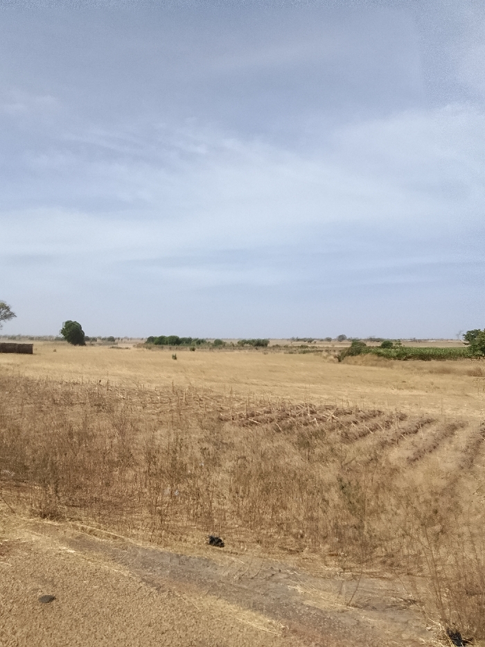 The image displays an expansive, parched agricultural field in Shendam, Nigeria, under a pale blue, hazy sky with scattered wispy clouds