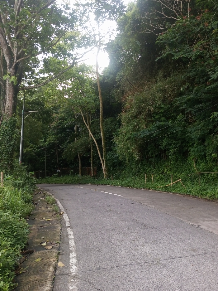 A winding asphalt road curves through a dense, green forest. Lush vegetation covers both sides of the road, with tall trees casting shadows. A white line marks the edge of the pavement. A light pole stands near the roadside. The area exudes a sense of tranquility.