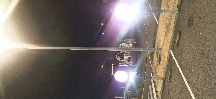 Two round street lights illuminate a parking lot at night. A tall, dark pole stretches between the lights. Shadows of playground equipment are visible in the background. A narrow strip of grass separates the parking lot from the black road with white parking lines. The lights cause glare that obscures the details of the dark night sky.