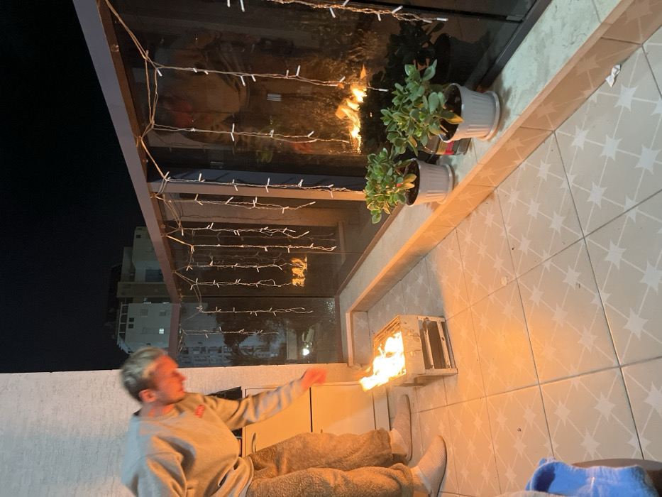 A male individual with light-colored hair, dressed in a grey sweatshirt, textured tan trousers, and light-colored slippers, is positioned on a tiled residential balcony in Kiryat Bialik, Israel, during nighttime hours. He is observed leaning forward, directing his attention toward a small, square-shaped, light-colored metal brazier situated on the tiled floor, which contains an active fire producing visible orange flames. A glass balcony railing, adorned with vertically strung white string lights, separates the balcony from the external environment. Two green potted plants in white containers are placed on a low, raised ledge directly behind the glass railing. The balcony floor is covered with light-colored tiles featuring a repeating star-shaped pattern. The background beyond the balcony is dark, showing the silhouettes of distant multi-story buildings and faint lights at street level. Reflections of the fire and the individual are visible on the glass railing surface.