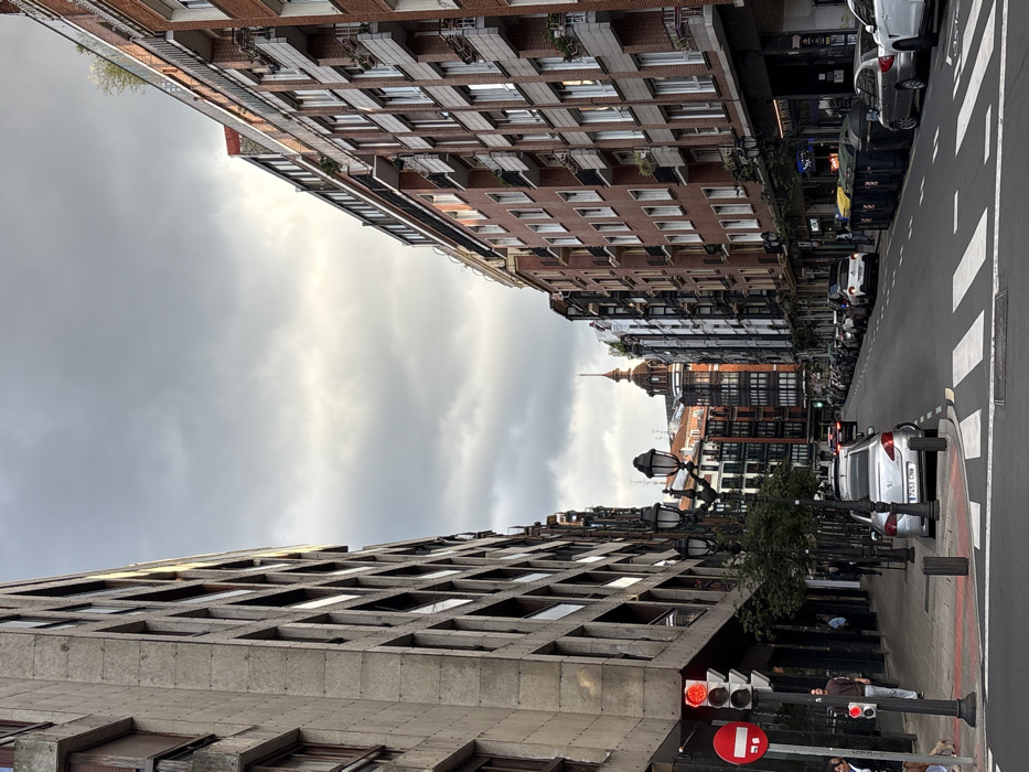 The image displays an urban street scene in Bilbao, Spain, looking eastward towards the Palacio de la Diputación Foral de Bizkaia, whose distinctive pointed spire and copper dome are prominent in the distant background. The sky is heavily overcast with a mix of dark and lighter grey clouds. On the left side of the street, a tall, multi-story building with a grey, concrete brutalist-style facade and grid-patterned windows dominates the foreground. At the base of this building, an intersection features a red pedestrian traffic signal and a circular red "no entry" sign with a white horizontal bar. A man wearing a brown long-sleeved top and dark trousers stands on the paved sidewalk near the traffic light, facing right. Further down this sidewalk, two ornate black lampposts with multiple lanterns are visible, interspersed with small green trees. The right side of the street is lined with multi-story residential buildings featuring reddish-brown brick or stucco facades, multiple windows, and small balconies, some adorned with potted plants. The ground levels of these buildings house commercial establishments. A continuous line of parked vehicles, predominantly cars, occupies the right curb, followed by several dark grey municipal recycling bins. The asphalt roadway in the immediate foreground is marked with white pedestrian crossing stripes. Numerous vehicles are parked along both sides of the street further down the block, and several cars are in motion, indicating active traffic. The entire scene is illuminated by diffused daylight.