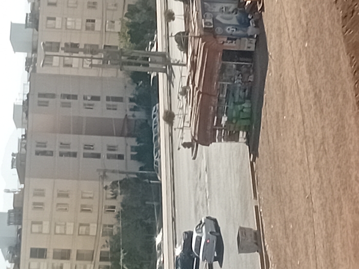 This image captures an elevated daytime view of a city street in Unknown, Unknown. In the immediate foreground, a reddish-brown unpaved area is visible, with a light-colored, rectangular dumpster placed on the left. Beyond this, a multi-lane asphalt road stretches across the frame. A silver sedan is in motion, traveling from left to right in the middle lane. On the right side of the road, a freestanding commercial kiosk with a reddish-brown awning displays various goods, including green packaged items, and features an air conditioning unit on its side. A tall, multi-component utility pole or traffic signal structure stands behind the kiosk. Across the road, green foliage lines the street, behind which several light-colored vehicles are parked in a row. The background is dominated by multiple light-colored, multi-story apartment buildings, each with numerous windows, extending beneath a clear sky with distant, hazy hills or mountains visible on the horizon. No individuals are clearly discernible in the scene.