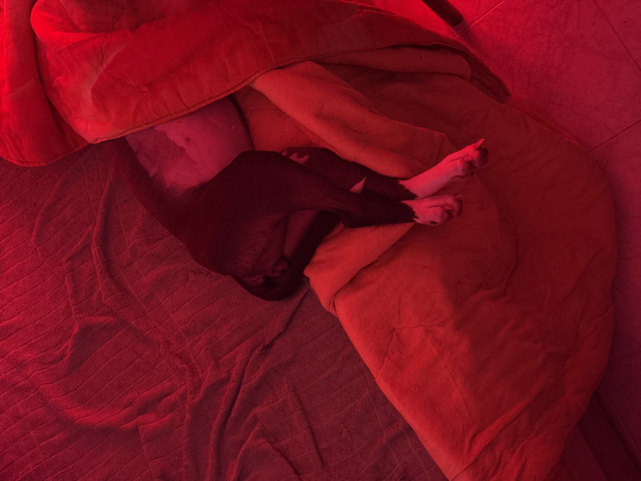 The scene is illuminated by red ambient light, depicting an indoor environment. A dark-colored canine, identified by its partially visible torso and legs, is observed in a curled, resting posture. The animal presents white markings on its forepaws and hind leg. Its ventral torso region appears lighter in pigmentation. The canine rests upon a textured red blanket that covers a significant portion of the lower and central image frame. Another red, possibly quilted or padded, blanket partially covers the canine's upper body from the right side. A greyish-brown, textured blanket is visible beneath the red illumination in the upper-left quadrant. A small section of light-colored flooring is discernible in the bottom-right corner. The specific location within the city of Budva, Montenegro, cannot be determined from the visual information provided.