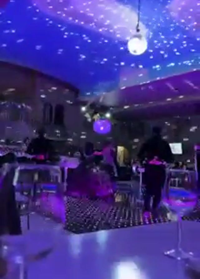 interior of an event space decorated with a starry night effect on the ceiling. A disco ball hangs from the ceiling, reflecting light around the room. In the center of the room, people stand on a patterned dance floor. Tables are set with glassware, and event staff are visible in the background. The room is lit with blue and purple lighting.