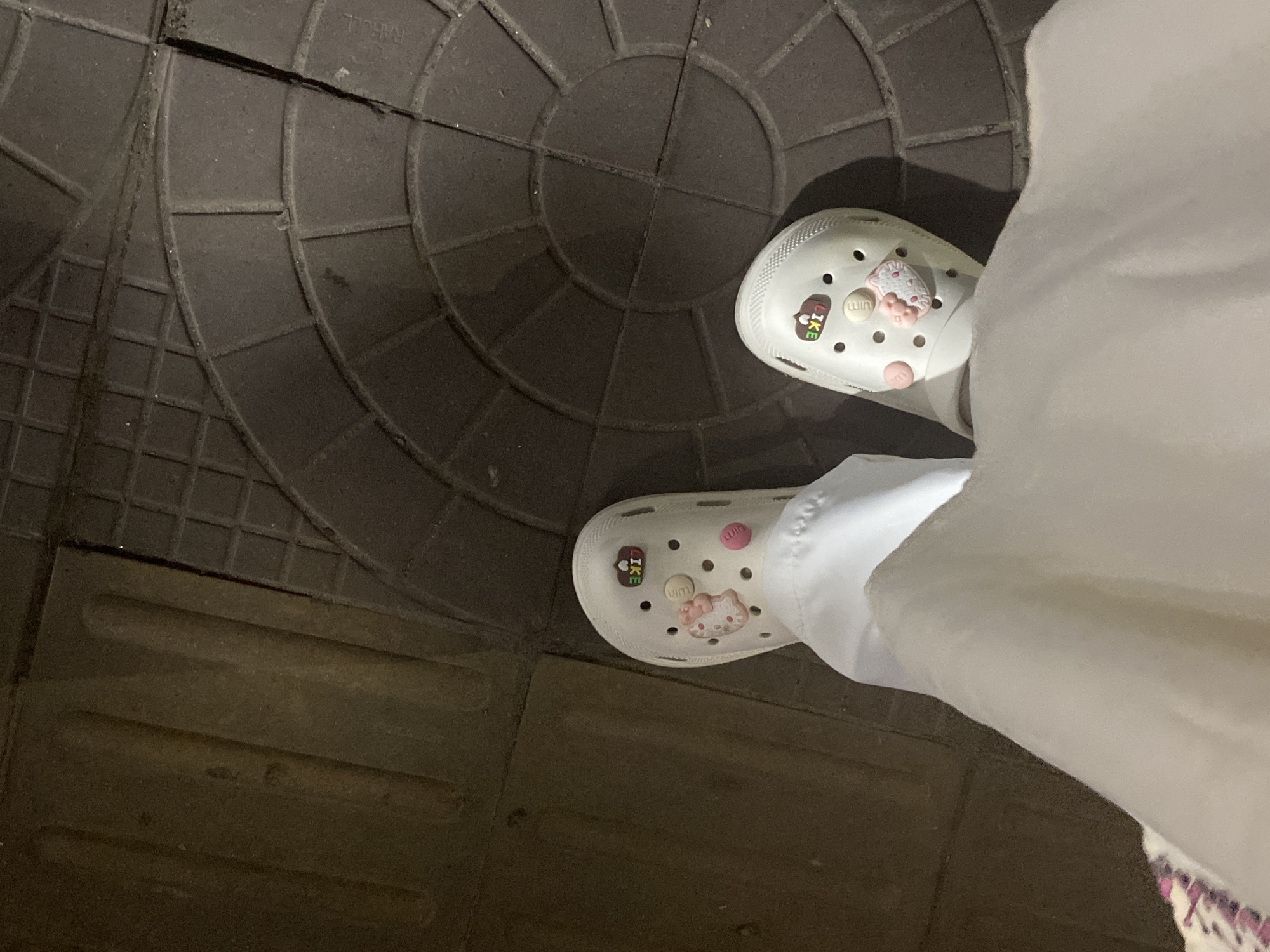 person wearing white Crocs with charms standing on a dark gray paved surface with a circular pattern, next to an area of rectangular paving