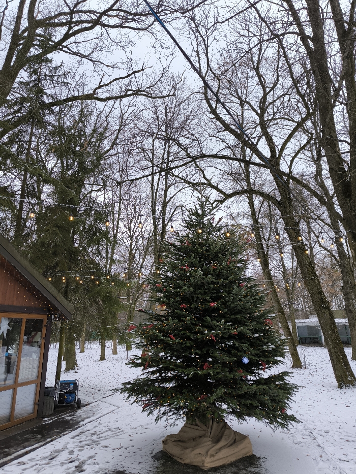 An outdoor winter scene in Vinnytsia, Ukraine, depicts a park-like environment under an overcast sky. A prominent evergreen Christmas tree, approximately 3-4 meters tall, stands centrally in the mid-ground. It is decorated with numerous small, warm-toned string lights and red ornaments, with one discernible blue/silver bauble. The base of the tree is encased in a light-brown burlap wrapping, resting on a dark, possibly paved, surface partially covered by snow. To the immediate left, a section of a wooden structure, likely a small building or kiosk, is visible. It features a dark-brown sloped roof, brown siding, and a large window displaying a white star decoration. Adjacent to this structure on the snowy ground, a blue portable generator with wheels is positioned. A dark, possibly rectangular, object is located next to the generator. Strands of globe-style string lights are suspended horizontally across the scene, strung between the bare branches of deciduous trees. The ground is covered with a thin layer of snow, revealing scattered leaves and branches beneath. A dark, possibly cleared, path runs in the foreground near the wooden structure, extending towards the Christmas tree. Numerous bare deciduous trees and some evergreen trees populate the background, with a light-colored, possibly blue-roofed, open-sided structure faintly visible among them in the far right background. No individuals are present in the scene.