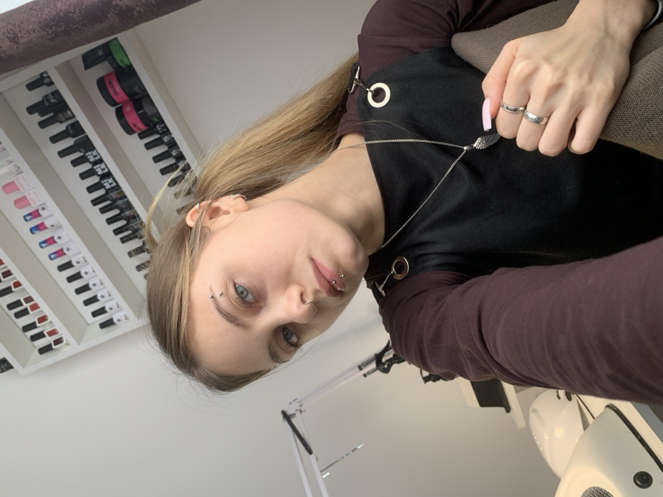 A young female is depicted in a waist-up, forward-facing selfie, taken indoors in the city of Фоки, Russia. She has light brown hair tied into a ponytail, blue eyes, and multiple facial piercings: a barbell above her left eyebrow, a septum ring, and two labret piercings below her lower lip. She wears a dark brown long-sleeved shirt beneath a black top or apron featuring gold-colored ring adjusters on the straps. A silver-colored chain necklace with a wing-shaped pendant is visible. Her left hand, adorned with three silver-colored rings on her ring and middle fingers and manicured nails with light pink polish, holds a brown fabric item. The background consists of a white wall. To the upper right, a white wall-mounted shelf system displays multiple rows of various nail polish bottles and containers. To the left, an adjustable white desk lamp with a metallic arm is present, along with partially visible white nail salon equipment, including what appears to be a nail dust collector and a UV/LED curing lamp. A dark-colored curtain is partially visible on the far right edge of the frame.