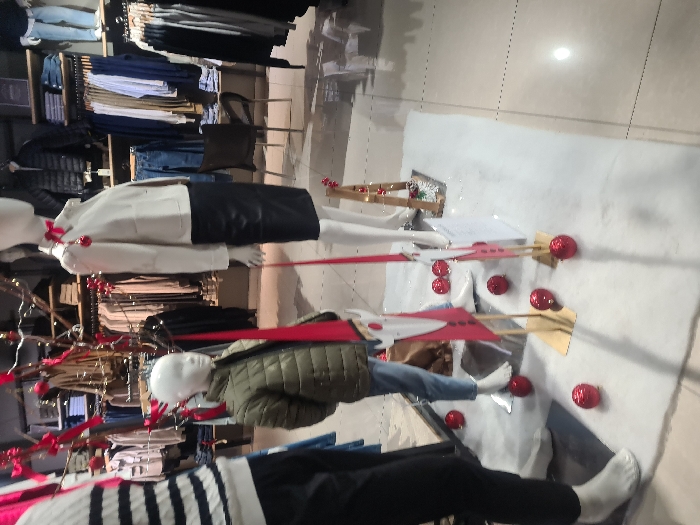 A store display features mannequins adorned with clothing. One mannequin wears a white jacket and black skirt, another a green jacket and jeans, and a third is dressed in a black and white striped top and black pants. The display incorporates red Christmas ornaments scattered on a snowy surface and branches with red bows, creating a festive ambiance. Garments on racks are visible in the background.