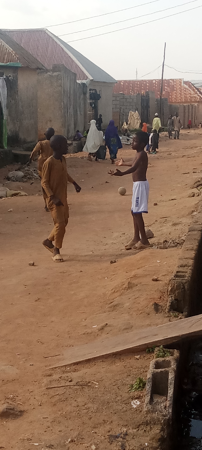 The image captures a daytime scene on an unpaved, reddish-brown dirt road within a residential sector of Kwamba, Nigeria
