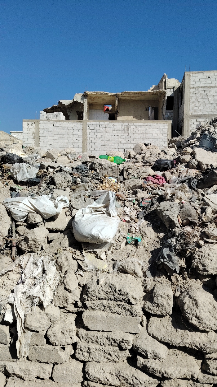 The image displays a devastated urban landscape in Al-Qaboun Municipality, Syria, under a clear blue sky. The foreground and midground are dominated by a massive, uneven mound of accumulated debris, composed primarily of concrete fragments, rocks, and soil. Interspersed within this rubble are various items of refuse, including several large white fabric sacks, torn pieces of black and white plastic sheeting, a green plastic bottle, and other scattered discarded materials. In the background, partially collapsed multi-story buildings constructed from white concrete blocks are visible. These structures exhibit severe damage, with missing sections of roofs and walls, exposing their interiors. One second-story room in a central building clearly displays a red and blue object within its exposed interior space. No individuals are present in the scene.