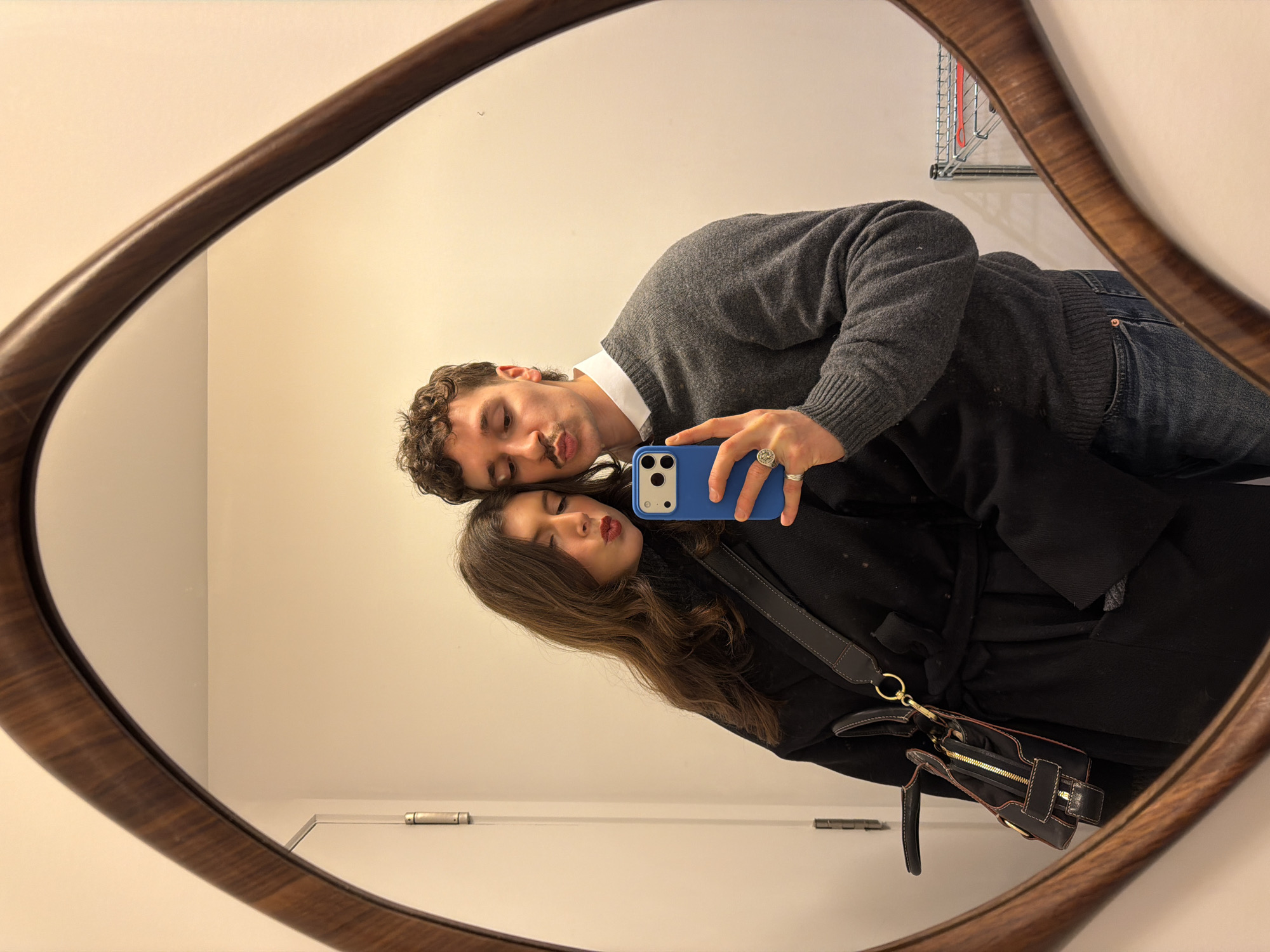 The image depicts a couple taking a selfie in a mirror. The mirror has an irregular shape with a brown wooden frame. The man has curly hair and is wearing a grey sweater over a white collared shirt and blue jeans. The woman has long brown hair and is wearing a black coat with a shoulder bag. They are both pouting at the camera. The background is a plain white wall. A metal shelf is visible in the upper right corner. The location is speculated to be in the city of Montreal, Canada. A door with a silver hinge and knob is visible at the bottom center of the mirror.