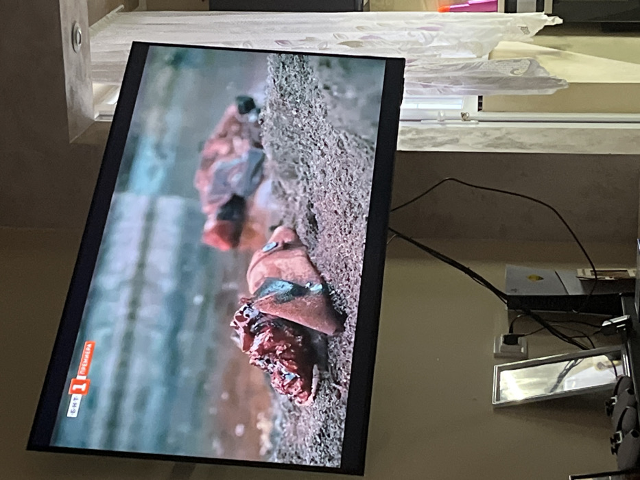 The scene is an interior room located in Yoakim Gruevo, Bulgaria. A black flat-screen television is mounted on a light brown wall, displaying content that shows two distinct pieces of organic matter resting on a damp, coarse, granular surface. The foreground piece is reddish-brown with areas appearing dark blue or teal, while a second, more fragmented and darker piece lies further back. The background is blurred, depicting a wet, possibly submerged, area. The top-left corner of the screen bears the "БНТ 1" logo and the word "ПРЕМИЕРА" (PREMIERE). Below the television, black cables descend. A white PlayStation console and a framed mirror are visible on a surface to the left. A window with white sheer curtains is present on the right, admitting ambient light. No individuals are visible.