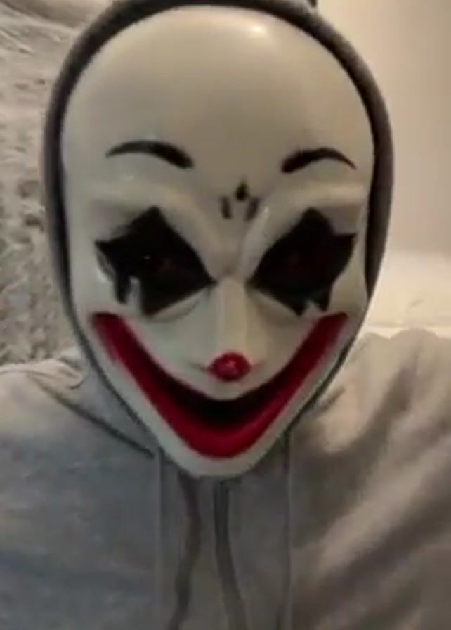 A person wearing a gray hooded sweatshirt and a white clown mask with black and red detailing is featured in a close-up video