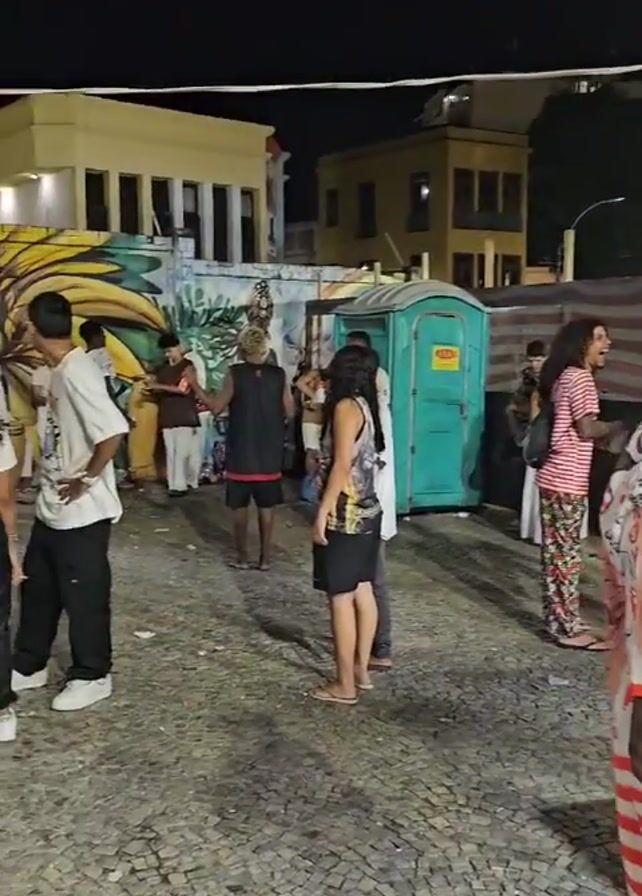 At night, a crowd gathers on a cobblestone surface outside buildings, near a turquoise portable toilet, and by a mural with vibrant green and yellow colors depicting plants and a sculpture of a Black figure. Several people are dancing to the rhythm created by three standing drums. A man in a red-and-white striped shirt and light shorts stands in the foreground. Some people wear casual clothing, while others are barefoot. The atmosphere seems lively, with music and dancing adding to the vibrant environment.