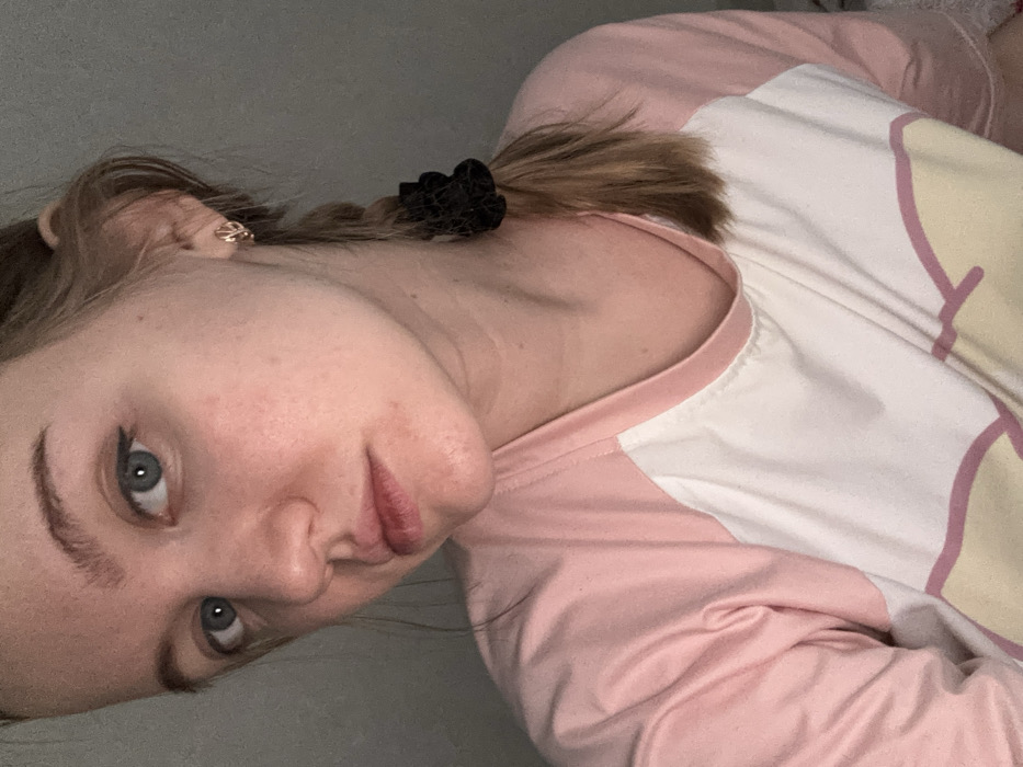 A close-up portrait depicts a female individual, located in Nizhnekamsk, Russia. Her head and upper torso are visible. She has fair skin with minor blemishes, blue eyes, and light brown hair. Her hair is styled in a single braid, positioned over her right shoulder (viewer's left), secured by a black scrunchie. A small, gold-colored stud earring, featuring an abstract, possibly leaf-like, design, is present in her right earlobe. Her eyes are lined with dark eyeliner, creating a subtle winged effect. She is wearing a raglan-style shirt with light pink sleeves and a white body. A partial graphic, consisting of light yellow and pink lines, is visible on the lower white portion of the shirt. Her expression is neutral as she looks directly at the camera. The background is an indistinct, uniform dark gray surface, indicative of an indoor setting with soft, ambient lighting.