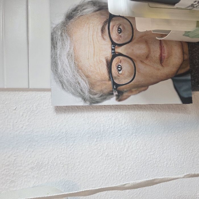 The image presents a close-up portrait of an older male identified as Woody Allen, occupying the right half of the frame. The individual has gray hair, a fair complexion, and is wearing black-rimmed eyeglasses, through which his eyes are visible, directed forward. The portrait is positioned upright on an unspecified surface. To the immediate left of the portrait, a textured, off-white wall with faint blue-grey discoloration is visible. A white fabric strap or cord runs vertically along the left edge of this wall. Above the portrait and to its right, a section of white, horizontally tiled wall is visible. The lower right portion of the portrait is partially obscured by several white and translucent plastic containers, consistent with personal care products, suggesting a shelf or countertop environment. The specific location within the city of Haifa, Israel, cannot be determined from the visual information provided in the image.