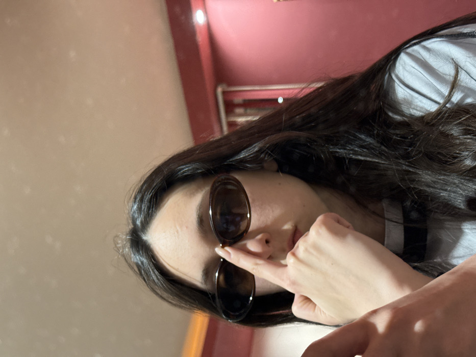 This image shows a female individual indoors in Galabovtsi, Bulgaria. The subject, a young adult with long, dark brown hair parted centrally, occupies the majority of the frame, looking directly forward. She wears dark, oval-framed sunglasses. Her left index finger is positioned on the bridge of her nose, making contact with the sunglasses. A light-colored top, possibly a t-shirt, with a dark horizontal stripe across the chest area is visible. A portion of her right hand is out of focus in the lower left foreground. The background features a reddish-pink wall on the right side, displaying a circular light source reflection and a vertical light-colored element, possibly a doorframe or curtain. The ceiling, visible in the upper portion, is a lighter beige or off-white color, exhibiting a slightly mottled texture or reflections. The environment is illuminated by artificial indoor lighting.