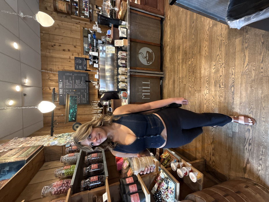 The image depicts the interior of a coffee shop identified as "The Mill," located in Lincoln, Nebraska, United States. A female subject stands prominently in the center foreground, facing the camera with a slight smile. She has wavy, light brown hair with bangs. Her attire consists of a dark blue denim vest, unbuttoned at the lower front revealing her midriff, dark-colored fitted pants, and light brown sandals. She holds a clear plastic cup containing an iced beverage in her right hand. A small black shoulder bag hangs on her left side. To the left, a series of wooden shelves are stocked with various products. The upper shelves hold large glass jars containing bulk items, including red and green spherical objects. Below these, dark glass jars labeled "THE MILL" are visible, likely containing coffee beans or grounds. The lowest visible shelf displays packaged goods, including black bags also marked "THE MILL." A portion of a wooden barrel is seen at the far lower left. The background features the establishment's service counter. A stainless steel espresso machine is central to the counter, with various coffee-making equipment and bottles arranged around it. Behind the counter, a partially obscured individual in a dark shirt is visible, presumably an employee. Two black menu boards hang above the counter, displaying "THE MILL" branding and lists of espresso, hot, cold brew, and signature cold beverages. The counter front below features panels with "THE MILL" logo on the left and a coffee cup icon on the right. A display case with baked goods is visible on the far right of the counter. The interior walls are predominantly covered in vertical wooden paneling, with a section of exposed brick visible on the upper left wall. The floor is light-colored wood with visible grain. Overhead, multiple pendant lights with white spherical shades illuminate the space. A black trash receptacle is partially visible in the lower right foreground.