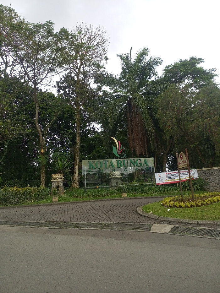 A sign reading "Kota Bunga" stands amidst lush greenery, including tall trees and a palm