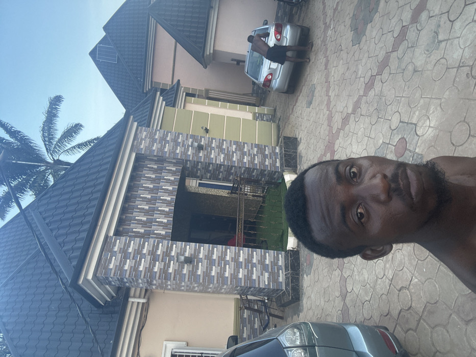 The scene depicts a paved residential compound in Nnewi, Nigeria, with multiple buildings under a clear sky. In the immediate foreground, a dark-skinned male with short dark hair, a beard, and a mustache directly faces the camera, appearing to take a selfie. He is shirtless. His expression is neutral. Behind the foreground subject and to his left, the rear portion of a dark-colored SUV is visible. To the right, another dark-skinned male, shirtless and wearing dark shorts, is positioned at the rear of a silver sedan (likely a Toyota Corolla), appearing to engage with its trunk or rear bumper. The primary building in the center-left features a light beige facade with a prominent central porch area adorned with patterned grey and blue tile-work. This section has a dark grey tiled roof, two wall-mounted light fixtures, and a decorative metal railing enclosing a small patio space with artificial green turf. A palm tree is visible behind the building. To the right of the central building, another structure with a light green facade and a dark grey tiled roof is visible. Further right and behind, a third building with a light pink facade and a dark grey tiled roof is present, with a single solar panel mounted on its roof slope. The entire ground area within the compound is paved with interlocking concrete blocks in shades of grey, red, and brown.