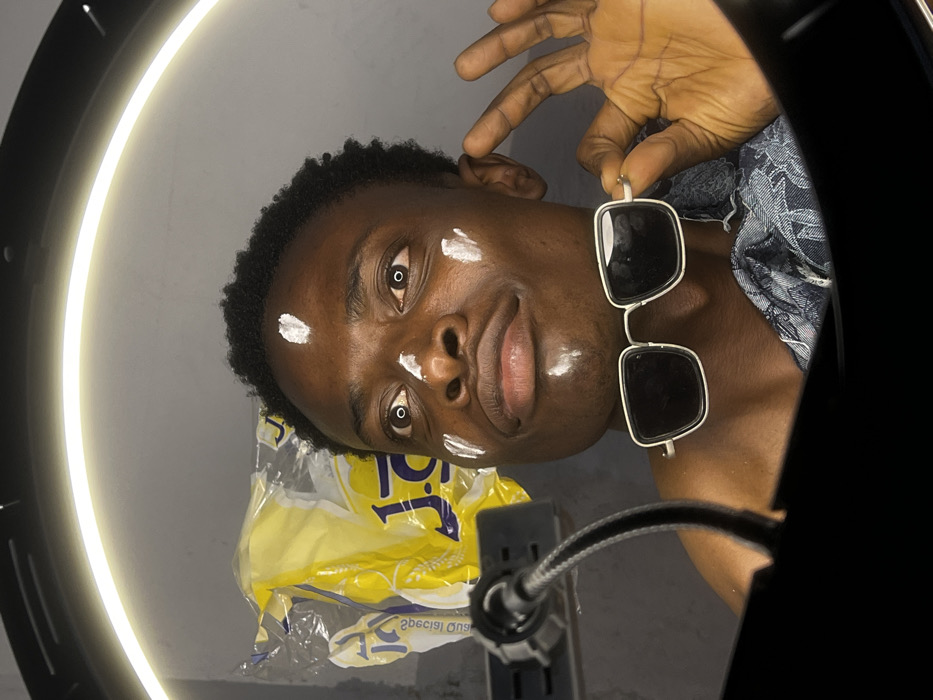 A close-up, front-facing image captured in Bar Gada, Nigeria, depicts a male individual with dark skin and short, dark, curly hair. White markings are present on his face: one dot on the forehead, two on each cheekbone, and one below the lower lip. His eyes are wide, and his lips are slightly pursed. He appears bare-chested, with a dark blue or grey patterned garment draped over his right shoulder. His right hand, with fingers splayed, holds a pair of square-framed, silver-rimmed sunglasses below his chin. The scene is illuminated by a prominent ring light, which frames the upper portion of the image and is reflected in the subject's pupils. In the background, behind his left shoulder, a large, translucent plastic bag, possibly yellow, with mirrored text, is visible. To the left, a wall-mounted electrical outlet with two receptacles is present, connected to the flexible arm supporting the ring light. The background wall is plain and light grey.