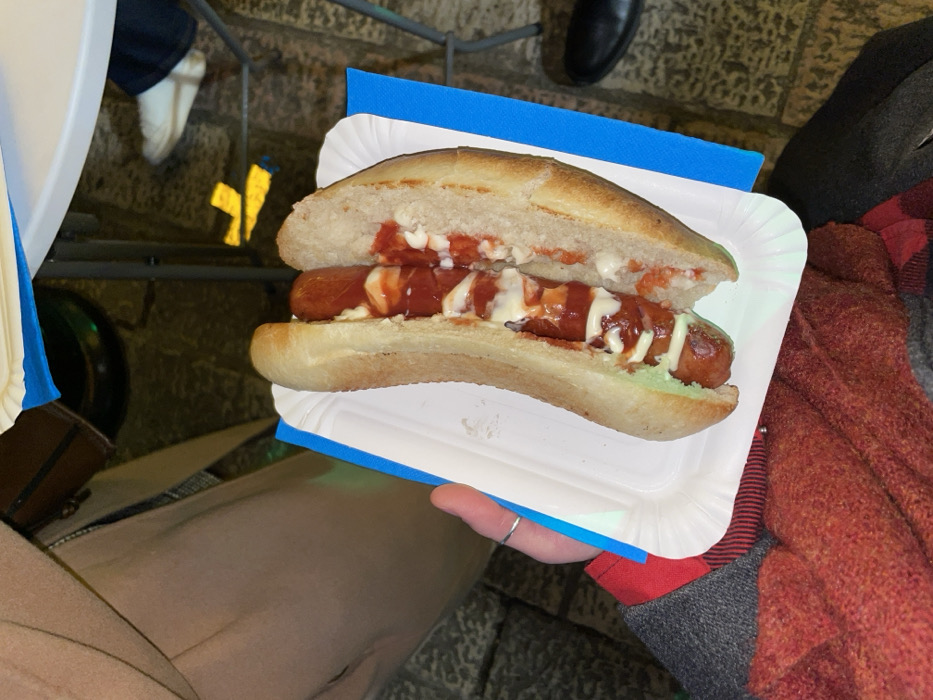 A hot dog on a white paper plate with a blue border is held by a person wearing a ring on their thumb. Ketchup and mayonnaise are drizzled on the sausage inside the bun. Other people are partially visible in the background, including someone wearing a black shoe and another wearing white sneakers. The holder of the hot dog is wearing tan pants and a red and black plaid shirt or sweater.