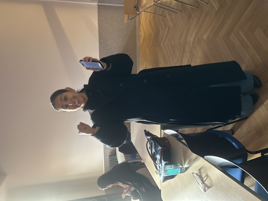 A smiling woman in a long, dark coat and jeans holds a phone up. She appears to be in a classroom with tables, chairs, and a herringbone wood floor. A purse, a bottle of water labeled "Be the Change," and glasses rest on a table. Another person is seated at a table in the background. The lighting in the room seems dim, with a bright light casting a shadow on the wall.