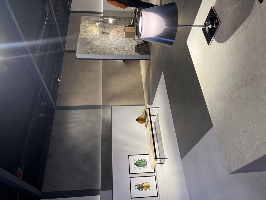 This image displays a modern interior design showroom, identified as an exhibition booth, most probably at Cersaie, the international exhibition of ceramic tile and bathroom furnishings, located at Bologna Fiere in Bologna, Italy
