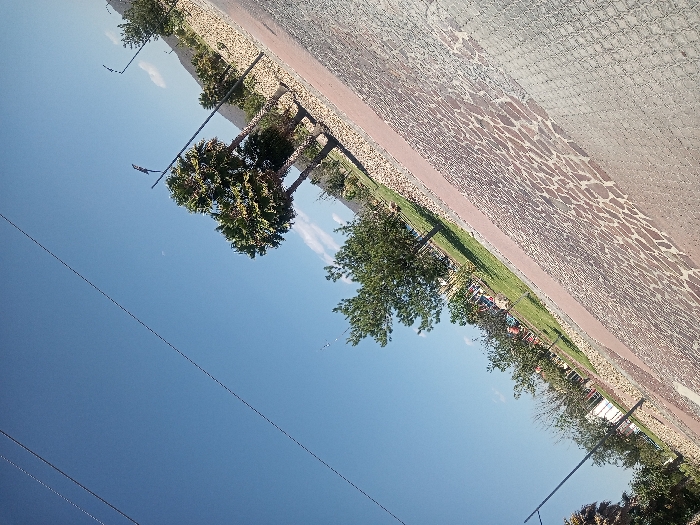 The image depicts an outdoor scene in La Venta, Mexico, under a clear blue sky with minimal white clouds. The ground in the foreground and midground consists of a paved surface, featuring sections of grey grid-patterned pavers, a reddish-brown strip, and grey pavers with an irregular, cracked texture. Adjacent to the paved area, a strip of green grass extends, containing multiple trees, including several tall palm trees with green fronds on the right side and smaller deciduous trees with green foliage further left. Patches of light-colored gravel are visible within and alongside the grass strip. Several dark-colored streetlights or utility poles are present, extending vertically from the ground. Multiple thin, dark power lines traverse diagonally across the upper portion of the sky. The background on the right reveals a hazy outline of distant hills or mountains, while faint structures are discernible among trees on the left. The scene is illuminated by bright daylight; no individuals or vehicles are present.