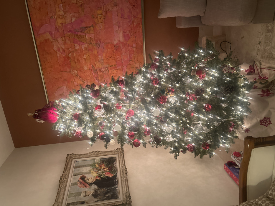 A decorated Christmas tree with white lights, red and silver ornaments, and a red topper is the image's focal point. The tree is positioned against a wall with a large abstract painting in shades of red and orange. Below the tree is a framed portrait of a woman with flowers. A glimpse of a chair and patterned bedding can be seen to the right, suggesting a domestic setting. The lighting in the room is warm.