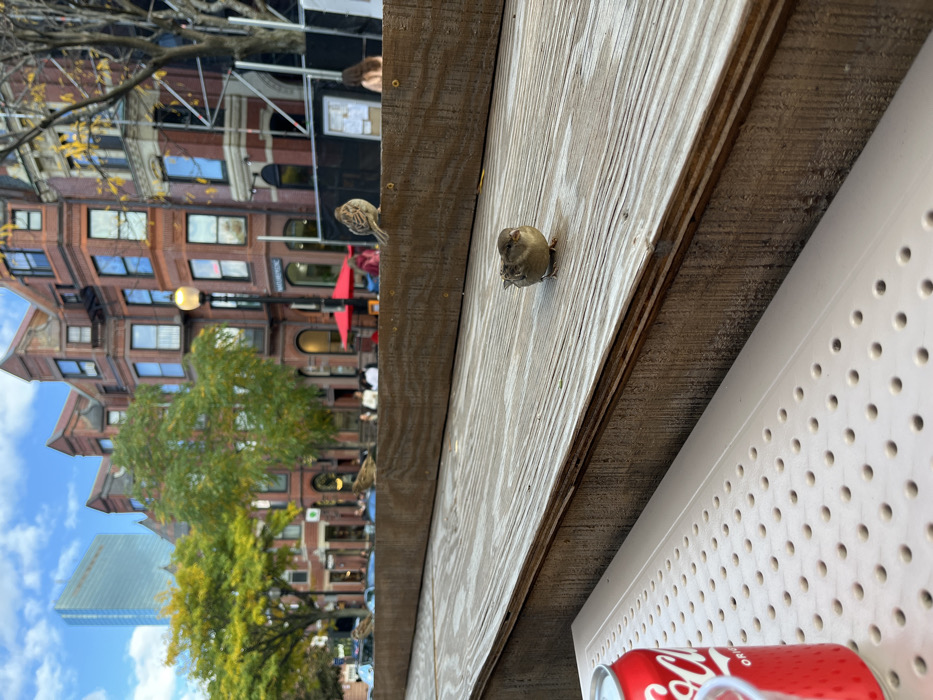 This image depicts an outdoor urban cafe scene in the Back Bay neighborhood of Boston, Massachusetts, United States. In the immediate foreground, a white perforated plastic table surface is visible on the bottom left, partially obscured by a red Coca-Cola can. A small house sparrow (Passer domesticus) with brown and grey plumage stands facing forward on a weathered wooden bench or planter box located directly behind the table. In the midground, the wooden structure extends horizontally across the frame, with several other sparrows perched along its length. Beyond this barrier, an outdoor dining area is visible, populated by several individuals seated at tables, some shaded by red umbrellas. The background features classic multi-story brick row houses and buildings, characteristic of Boston's architecture, lining what appears to be a street. A streetlamp with a glowing fixture is present, and a street sign on one building reads "MARLBOROUGH" above what appears to be "NATUREPEDIC." Trees with green and yellow foliage indicate an autumn season. In the far background, a tall, modern glass skyscraper is visible against a partly cloudy blue sky, further confirming the urban setting. Construction scaffolding is present on the right side of one brick building.