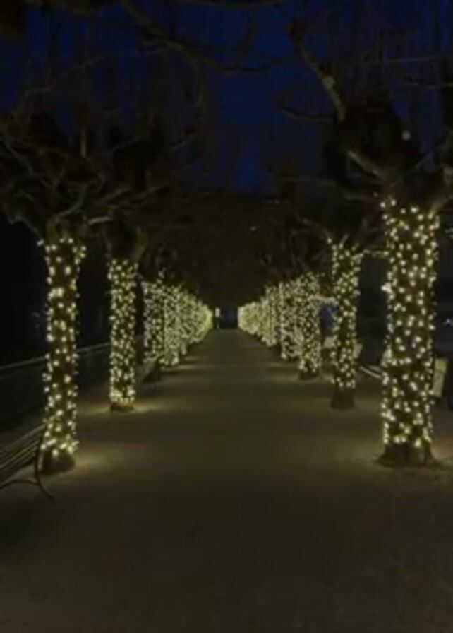 pathway at night, lined with trees. Each tree trunk is wrapped in strings of small, warm-toned lights. The path surface is gravel or small stones. The sky is dark blue, indicating nighttime. There are bare tree branches overhead, forming a canopy. A black metal bench is visible on the left side of the path. In the distance, the lights narrow, creating a vanishing point effect. No people are visible.